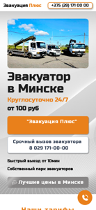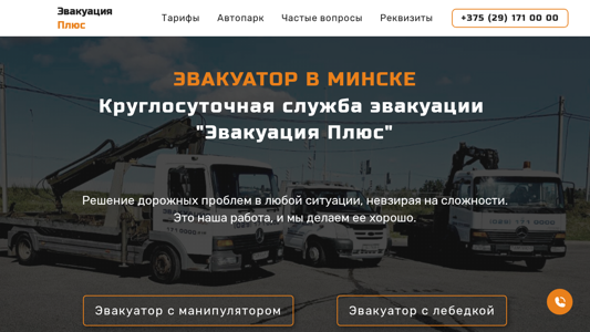 | AI-анализ | --- The web project "Evakuacia Plus" is a 24/7 emergency towing service based in Minsk, Belarus. The company offers vehicle evacuation services ensuring the utmost care and delicacy during transportation. Their round-the-clock availability includes holidays and weekends. Keywords associated with the project include 'evacuator', 'Minsk', 'vehicle', and 'towing'. The project's title translates to "Evakuacia Plus - Towing in Minsk. 24/7". The company provides quick and efficient solutions to road issues in any situation. They own a fleet of tow trucks, equipped with a crane manipulator or a winch, to handle various types of vehicles and situations. Their prices start from 100 Belarusian rubles. The website includes sections for tariffs, frequently asked questions, and contact information. |