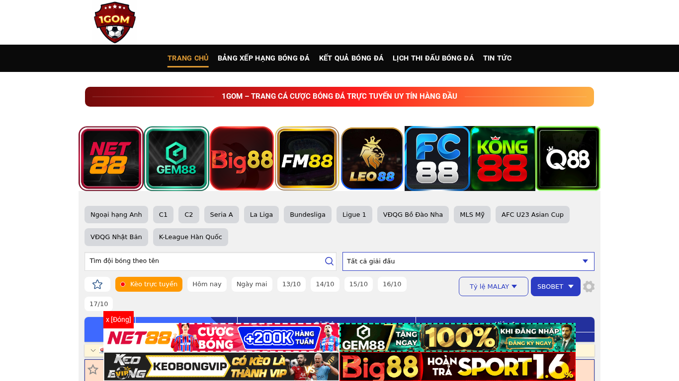 | AI-анализ | This website is a professional betting platform with attractive odds titled "1GOM – Nơi hội tụ cược thủ chuyên nghiệp với tỷ lệ kèo hấp dẫn". It offers high-quality soccer betting with transparent odds, fast deposits and withdrawals, and welcome bonuses for new members. The homepage directs users to the soccer ranking table, soccer results, and soccer news on 1GOM – A top-rated online soccer betting site. Featured soccer leagues include the English Premier League, German Bundesliga, French Ligue 1, and Vietnamese VĐQG, among others. Users can select from various odds and leagues for betting, including real-time odds and various audio options. The website also provides data for other betting options. |