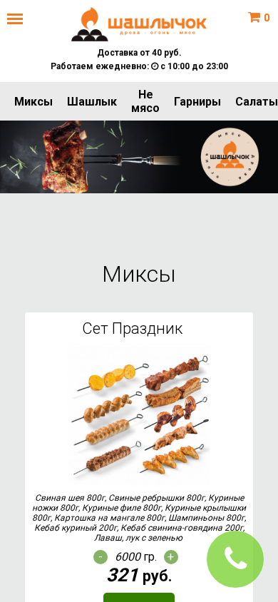 | AI-анализ | The portal Shashlychok is an online food ordering and delivery service in Minsk, Belarus. It offers a variety of dishes for purchase, including different types of shashlyk (grilled meat), salads, sides, and beverages. Users can place orders for mixes, sets, and individual items. The website lists several meat options, such as chicken, pork, and beef, along with vegetables like mushrooms and potatoes grilled on a mangal (barbecue). Prices range from 40 rubles for delivery to over 4000 rubles for larger sets. The portal operates daily from 10:00 to 23:00 and provides free delivery for orders above a certain amount. Contact information for ordering is provided. |