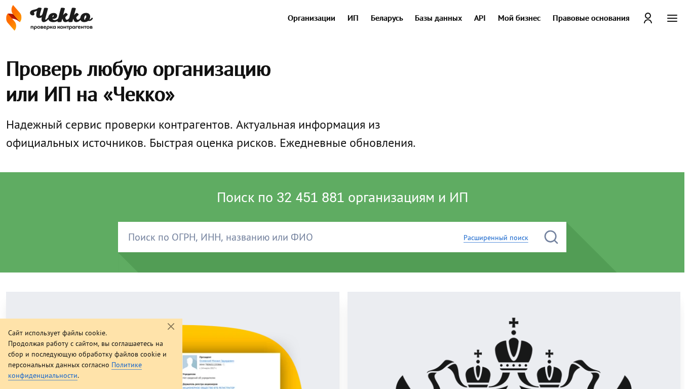 | SEO-описание | Портал "Чекко" предлагает быстро и бесплатно проверить любое юридическое или физическое лицо, зарегистрированное в Россйской Федерации |