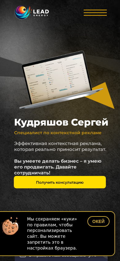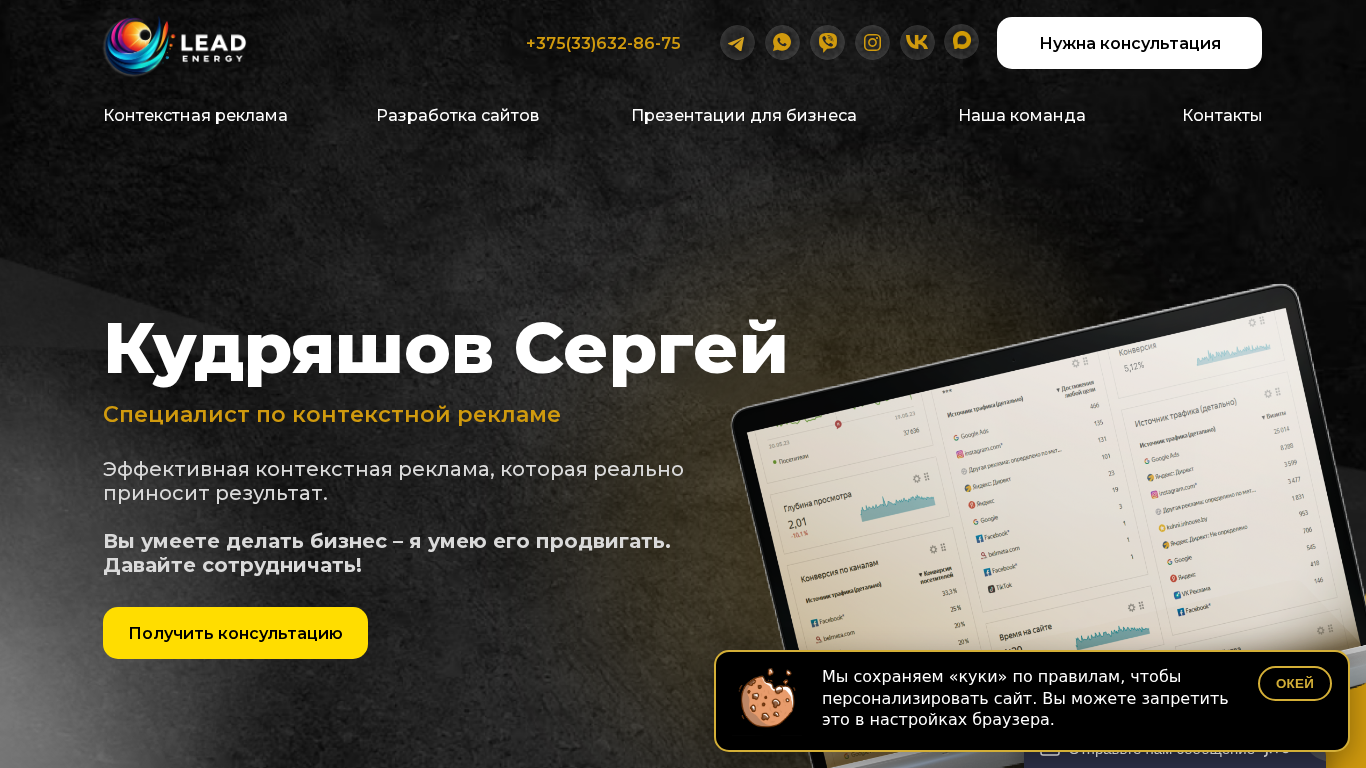 | AI-анализ | The web project 'Lead Energy' is a specialist in contextual advertising. Effective contextual and targeted advertising, which truly brings results, is provided. The website offers services in setting up and optimizing contextual advertising on Yandex.Direct and Google Ads, as well as on other platforms like Poisk, RSЯ, КМС, Retarget, and Remarket. Dynamic ads are also available. The specialist in contextual advertising at Lead Energy boasts a price starting from 700 BYN, and their contact number is +375 33 632-86-75. The website also includes sections for presentations for businesses, the team, and contacts. The specialist has over 7 years of experience in internet marketing and has worked with various business sectors, from selling fitness equipment in Perm to selling metalworking machines in Germany. They are a specialist in contextual |