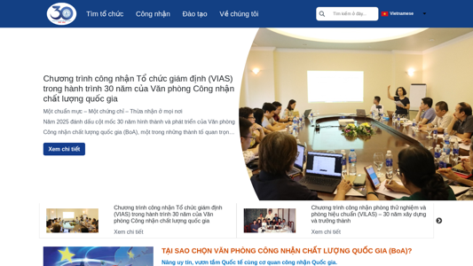 | AI-анализ | The website boa.gov.vn is the official website of the National Accreditation Body (BoA) in Vietnam. It provides information on the organization, its services, and various certification programs. The homepage includes sections for registering for newsletters, contacting BoA, and learning about the accreditation process. The website offers services related to testing, inspection, certification, and calibration, organized under submenus for various types of organizations and industries. These include Phong thử nghiệm và Phòng hiệu chuẩn (VILAS), Tổ chức giám định (VIAS), Tổ chức chứng nhận (VICAS), Phòng thí nghiệm y tế (VILAS Med), Tổ chức cung cấp thử ngh |