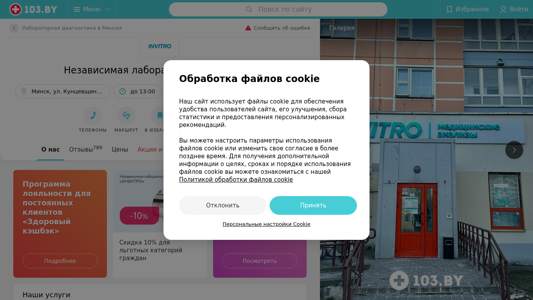 | SEO-описание | Независимая лаборатория ИНВИТРО Минск ул. Кунцевщина 27 – телефоны, время работы, отзывы и схема проезда в каталоге медицинского портала 103.by. |