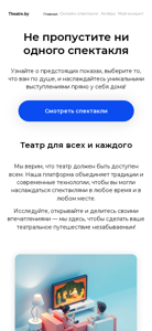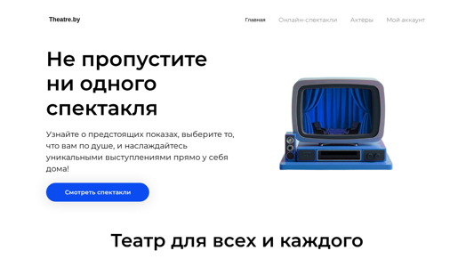 | AI-анализ | This website, titled "Главная" (Main) for Theatre.by, focuses on online theatre performances. The description mentions "Онлайн-спектакли" (online spectacles), "театр" (theatre), and "смотреть спектакли" (watching spectacles). Users can create a "Мой аккаунт" (My account) to keep track of upcoming shows and not miss any. The website offers "не пропустите ни одного спектакля" (don't miss any show), providing information about upcoming performances and allowing users to choose what they like and enjoy unique performances from the comfort of their own homes. The website aims to make theatre accessible to all, combining tradition and modern technology, and encourages users to explore, open, and share their impressions. The website is developed by ООО «Центр О |