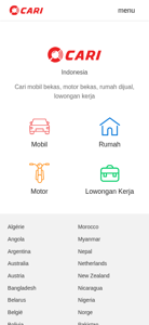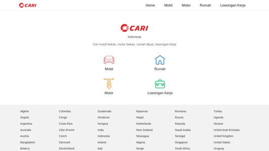 | AI-анализ | The web project 'Cari' is a search engine for used cars, motorcycles, houses for sale, and job listings in Indonesia. The title of the webpage includes the phrases 'Cari mobil bekas, motor bekas, rumah dijual, lowongan kerja' which translates to 'Search used cars, motorcycles, houses for sale, job listings' in English. The description meta tag provides the same information, emphasizing that the site is trusted throughout Indonesia. The top_words data indicates that the most frequently used keywords on the site are 'mobil', 'bekas', 'motor', 'rumah', 'lowongan', and 'kerja'. The site's navigation menu includes links to 'Mobil', 'Motor', 'Rumah', and 'Lowongan Kerja', each corresponding to the respective categories. The domain name is 'car |