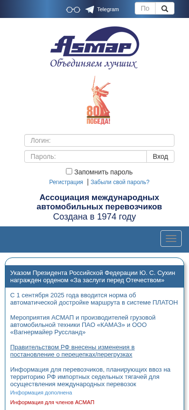 | AI-анализ | The website is for the International Automobile Carriers Association (ASMAP), established in 1974. It provides information for its members and international haulage truck importers planning to enter Russia. The site includes news on events, updates on regulations, and operational information. Members can access a discount on virtual fuel cards from Lukoil. The site also features an academy for professional training. There are announcements about the latest program for training driver-instructors and the first transport with the use of the MDP book through MAPP. Information is provided on the application of electronic transport documents, the registration process for Latvia's electronic queue system, and the resumption of traffic between Poland and Belarus. The site also includes news on changes in insurance requirements in Azerbaijan, the launch of the electronic queue at MAPP Verkhniy Lars, and the International Digital Transport Forum 2 |