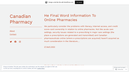 | AI-анализ | This online resource is titled "Canadian Pharmacy" and is a WordPress site (ghswed.wordpress.com). The description mentions the keywords "Canadian," "pharmacy," "online," and "website." The content discusses issues related to online pharmacies, including literacy, Internet access, credit score-cards, and security concerns for e-prescriptions in both the generating and acquiring settings. The site also includes a contact section and links to social media platforms, Twitter, Facebook, and Instagram. The site uses cookies and was created using WordPress.com. |