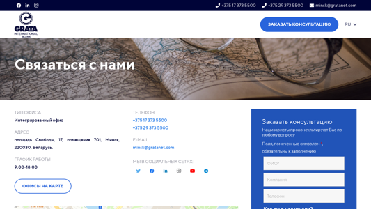 | AI-анализ | This online resource is the website of Grata.by, a legal company that provides legal services for businesses of various industries. The company employs top lawyers in Minsk. The website displays contact information, including phone numbers +375 17 373 5500 and +375 29 373 5500, and email address minsk@gratanet.com, for reaching out and scheduling consultations. The operating hours are from 9.00 to 18.00. The website also includes a map with the location of their integrated office at Ploshchad Svobody, 17, room 701, Minsk, 220030, Belarus. The site requires JavaScript for certain content and includes fields for the user to input their name, company, phone number, email |