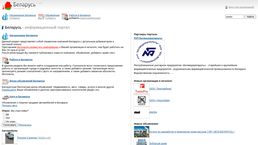 AI-анализ | This website is a Belarusian informational portal with sections for organizations in Belarus, job listings, announcements, Belarusian site rankings, and a dating service. The portal invites organizations in Belarus to add their information to the catalog for free, allowing them to publish company news, announcements, and price lists after registration. The "Work in Belarus" section enables job seekers to view job offers from organizations and recruitment agencies, as well as submit their resumes. Employers can browse resumes with photos based on job requirements and post vacancies for free. The "Announcements in Belarus" section is a free platform for placing advertisements for various goods and services, including real estate, cars, and other items. The portal also features a section for automobiles with recent listings for cars for sale in Belarus. Other news and updates from |