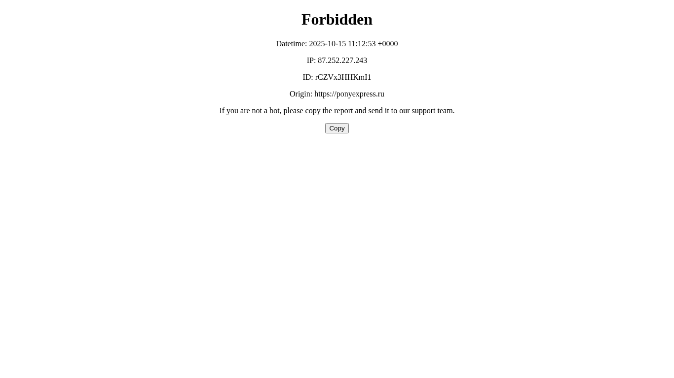 | AI-анализ | This website is for the Belarusian online delivery service "Pony Express." The title is not provided, but the description mentions the company name. The keywords include "forbidden," "datetime," "2025-10-15," "0000," "252," "227," "243," and "rczvx3hhkmi1," which appear to be error codes or identifiers. The top words indicate a request forbidden at the given datetime, with the IP address 87.252.227.243 and ID rCZVx3HHKmI1. The origin is stated as the HTTPS URL for Pony Express. |