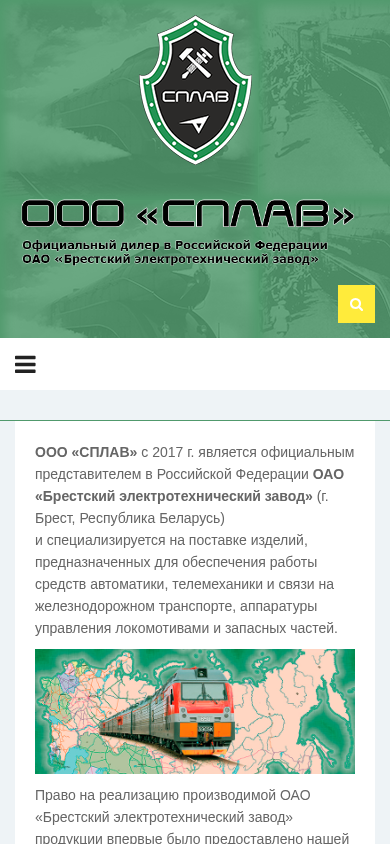 | AI-анализ | This online resource, titled "О компании - ООО СПЛАВ" (About Us - OOO SPLAV), is the official dealer of Брестский эlectroтехнический завод (Brest Electrotechnical Plant) in Russia. Established in 2017, OOO SPLAV specializes in supplying equipment designed for the operation of automation, telemechanics, and communication systems on rail transport, as well as control systems for locomotives and spare parts from Брестский эlectroteхнический завод (Brest Electrotechnical Plant), located in the city of Брест, Belarus. The right to sell the products manufactured by Брестский эlectroteхнический завод was first granted to OOO SPLAV in 2017 and is annually renewed with official letters from |
