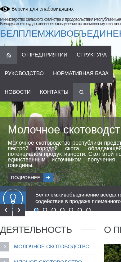 | AI-анализ | The web project "Belplemzhivoobiedinenie" is a Belarusian agricultural organization dedicated to livestock breeding. It specializes in milk and meat cattle, swine, horses, and sheep. The organization is part of the Ministry of Agriculture and Food of the Republic of Belarus and focuses on breeding and distributing high-performing livestock. The website provides detailed information on each livestock sector, including their respective populations, breeding methods, and achievements. The organization operates several plemenskye hoziaistva or specialized breeding farms for cattle, swine, horses, and sheep. Visitors can find news, contacts, and a normative base for each livestock sector on the site. |