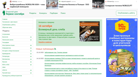 | SEO-описание | Фестиваль Открытый урок — самый массовый и представительный педагогический форум, принять участие в котором может каждый желающий. Фестиваль является постоянно действующий (c 2003 года) повседневный профессиональный инструментом учителя. Педагоги публикуют свои работы на сайте и знакомятся с опытом коллег. |