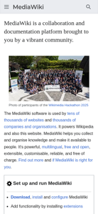 | AI-анализ | This online resource is the official website for MediaWiki, an open-source collaboration and documentation platform used by thousands of websites and organizations. MediaWiki provides tools to collect, organize, and make knowledge available to people. With a vibrant community, the website offers documentation, support, and developer resources for users and developers. Keywords associated with this website include "mediawiki," "documentation," and "wikimedia." The top words used on the site are "and," "mediawiki," "the," "page," "available," "get," "you," "are," "documentation," "view," "this," "wikimedia," and "now." The website also mentions an upcoming conference for MediaWiki users and developers. |