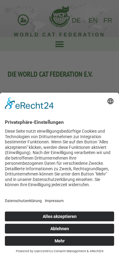 | SEO-описание | DIE WORLD CAT FEDERATION E.V. – kurz WCF – ist eine weltweit agierende Vereinigung von Katzenvereinen. Sie wurde am 20. August 1988 in Petropolis in der Nähe von Rio de Janeiro / Brasilien gegründet. Die WCF ist in Deutschland als internationale Organisation beim zuständigen Registergericht eingetragen. Präsidentin ist derzeit Anneliese Hackmann aus Essen. Zur Zeit |