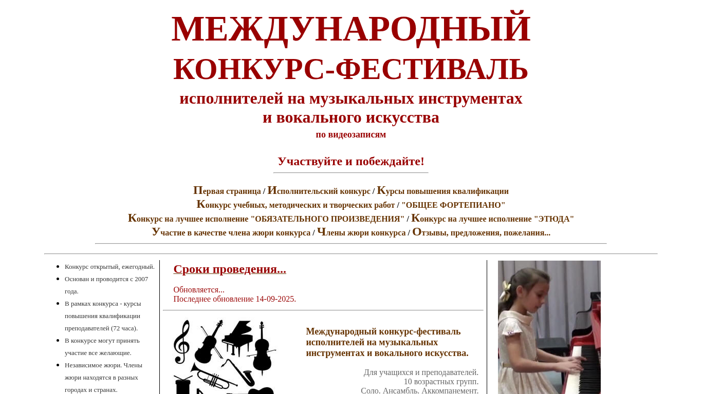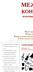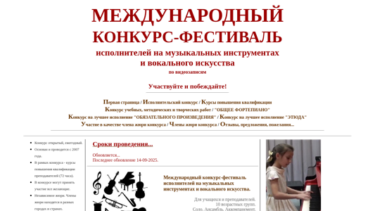 | AI-анализ | The portal is an international competition-festival for performers on musical instruments and vocal art through video recordings. Participate and win! The first page includes the performer contest, courses for qualification enhancement for teachers (72 hours), a contest for best performance of an obligatory work, a contest for best performance of an etude, and opportunities for jury members to join the competition. The contest is open, annual, and has been held since 2007. It offers courses for qualification enhancement for teachers, and is open to anyone. The jury is independent and consists of members in various cities and countries. Each participant receives a diploma for participation. Laureates and diplomas receive certificates of laureates and diplomas. Teachers receive honorary certificates for having trained a laureate or diplomat. During the contest, participants can hear and see their competitors on YouTube. The contest schedule is |