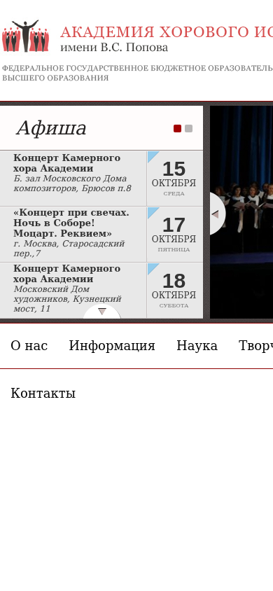 | AI-анализ | This website is dedicated to the Academy of Choral Art (AХИ) in Moscow, Russia. The title of the website is "АХИ.РУ" in Cyrillic script. The description section contains no specific text, but keywords and top words provide information about the organization. The keywords include "октября" (October), "года" (years), "академии" (academy), "искусства" (art), "музыки" (music), and "концерт" (concert). Top words indicate the names of specific events, such as "Концерт при свечах. Ночь в Соборе!" (Concert by Candlelight. Night at the Cathedral!), "Новые прочтения. Открытия и премьеры" (New Readings. Openings and Premieres |