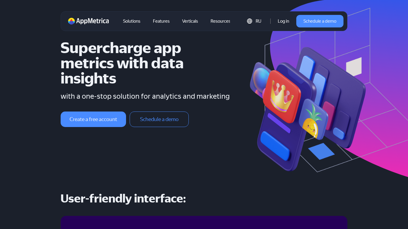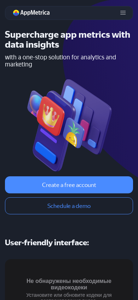 | AI-анализ | This website, titled "Mobile App Analytics - Grow Your Mobile Apps with AppMetrica Analytics," provides a one-stop solution for analyzing and marketing mobile apps. Keywords associated with the website include "analytics," "appmetrica," and "data." The website offers various solutions such as product analytics, revenue analytics, mobile attribution, audience analysis, and A/B testing. Users can access features like crash and error reports, push LTV and churn predictions, and a user-friendly dashboard. The platform supports subscription apps, e-commerce, and games, and offers a flexible approach to data. It is trusted by over 11,000 teams in 50 countries and has been used for 60,000 apps. The website allows users to increase income by deep diving into a complete stack of key app metrics, and offers a user-friendly interface with |