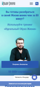 | AI-анализ | This online resource, titled "Ильдар Зинуров," is a personal website dedicated to offering life coaching services. The main keywords associated with the site include "жизни," "онлайн," "консультацию," and "отзывы." The top words on the site are "если," "когда," "без," "проблемы," "жизни," "записаться," and "чувствуете." The site offers a free training called "Идеальный Образ Жизни," along with online and offline psychological consultation services. The target audience appears to be mature individuals seeking to improve the quality of their lives, who are self-reliant, intellectually developed, and have high standards for themselves. The site offers help for those feeling overwhelmed, stuck, and in need of external resources to live their lives to the fullest. The website is |