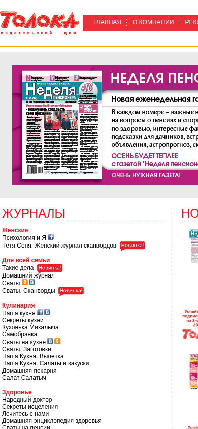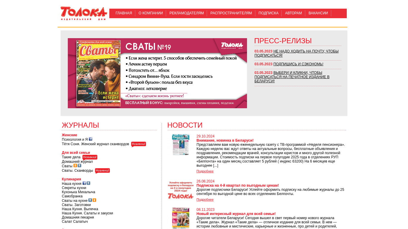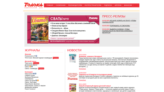 | AI-анализ | This website is the international publishing house Toloka (Toloka.com). The company offers various services and products to reclamoakers, reclamosellers, and distributors in Belarus, Russia, and Ukraine. It provides a subscription service in Belarus and Russia for journals, including a weekly pensioner newspaper, magazines such as "Женская психология и Я Тётя Соня" and "Домашний журнал Сваты", and specialized publications like "Наша кухня" and "Садовод и огородник". The website also features vacancies and press releases. Users can find information about authors, doctors, and various topics such as health, gardening, and DIY projects. The site includes a section for children called "Саша и Маша". Additionally, it offers various promotions and discounts for subscriptions. The website |