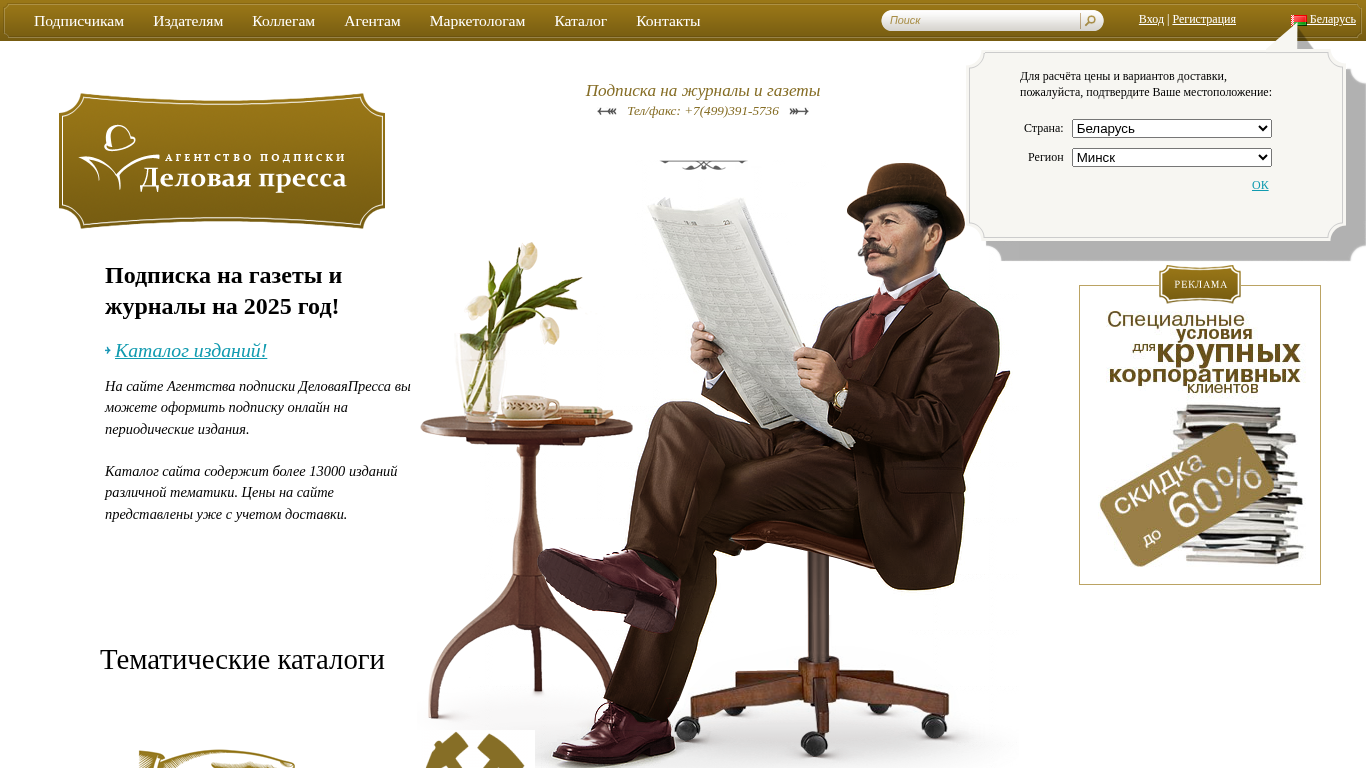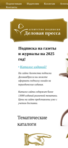 | AI-анализ | The website is an online subscription agency for Russian business press, "Деловая пресса" (Delpress.ru). Visitors can subscribe to newspapers and magazines for 2020, with a catalog of over 13,000 publications available. The subscription process can be done online, and delivery is included in the listed prices that remain constant throughout the subscription period. Subscriptions are available for both physical and legal entities, with options for postal or courier delivery in Moscow. The site features a unique system of multilevel thematic catalogs to help users easily find publications that fit their interests. Additionally, the site offers a "Subscription as a gift" service, allowing subscriptions to be purchased as gifts for others, and welcomes partnerships with regional alternative subscription agencies. |
