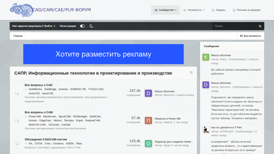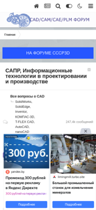 | AI-анализ | --- The portal cccp3d.ru is a useful forum for daily communication among users of CAD/CAM/CAE/PLM systems. The community features a forum, a gallery, a calendar, rules, a team, user tables, and leaders. It covers topics related to SAPR, information technologies in design and production, and various CAD systems including SolidWorks, SolidEdge, Inventor, KOMPAS-3D, T-FLEX, AutoCAD, nanoCAD, and more. Discussions cover CAM systems such as Power Mill, Mastercam, SprutCAM, NCManager, SolidCam, Artcam, EdgeCam, Vericut, Esprit, FeatureCAM, BobCAD-CAM, and GO2cam, as well as CAE topics such as modeling of metal and plastic casting, dynamics and strength, gas and |