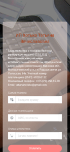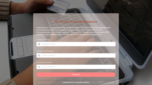 | AI-анализ | The web project 'Hotsko.1pay.by' is an online payment processing platform that allows businesses to accept payments using bank cards such as VISA, MASTERCARD, and БЕЛКАРТ. The project is registered with the Minsk Regional Executive Committee and its legal address is in Radoshkovichi, Minsk Oblast. The proprietor of the project, Tatiana Hotsko, has provided her identification number and contact information including a phone number and email address. The platform supports multiple payment methods, offers details about the payment process, and provides information on refunds and card holder recommendations. It also includes a policy on personal data processing and cookie settings. The business is located in Minsk and can be contacted through multiple channels including email and phone. |