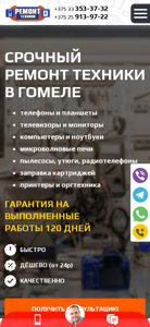 | AI-анализ | The website is a repair service based in Gomel, Belarus, offering repairs for various electronic devices and appliances such as mobile phones, computers, televisions, vacuum cleaners, microwave ovens, and more. The business is called Сельмаш and can be reached at the phone numbers +375 33 353-37-32 and +375 25 913-97-22. The repair shop is open from Monday to Friday, 9 AM to 8 PM, and on weekends, 9 AM to 5 PM. The address is given as ul. Efremova, 16 in Gomel. The website lists various services including quick and affordable repairs, replacement of screens and batteries, and repairs for various types of connectors. The repair shop has been in business for over 5 years and has |