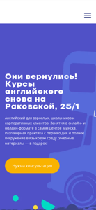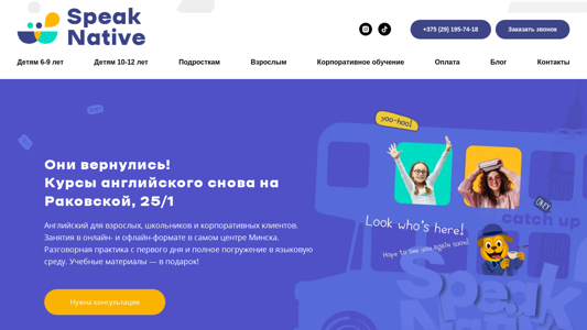 | AI-анализ | --- This website is a language school named Speak Native, located in Minsk, Belarus. It offers English language courses for various age groups including children aged 6-9, children 10-12, teenagers, adults, and corporate clients. The school employs expert teachers and uses modern textbooks for instruction. The teaching methodology focuses on communication. Users can register for classes by calling the provided phone number. The website also includes a blog and contact information for those interested in corporate training and further inquiries. The school requires consent for the processing of personal data before continued interaction. The English courses have resumed at their location on Rakovskaya, 25/1 in the center of Minsk. Instruction is available in both online and offline formats with a focus on conversational practice and immersion in the English language environment. Students receive learning materials as a gift. Consultations |