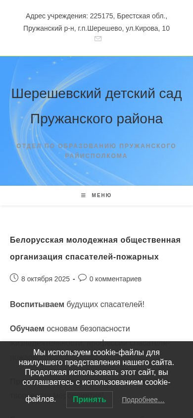 | AI-анализ | The website <shereshevo-sad.pruzhany.by> is operated by the Education Department of the Pruzhansky District Executive Committee in Belarus. It primarily focuses on a kindergarten named Шерешевский детский сад (Shereeshsky Detsky Sad, or Shereesh Kindergarten) located in the village of Shereeshvo. The website provides news, educational resources, and information on safety matters for parents and pedagogues. It also features articles on various topics related to childcare and development, including speech problems and solutions. The website also mentions a youth organization called Белорусская молодежная общественная организация спасателей-пожарных (Belarusian Youth Public Organization of Firefighters and Rescuers), which seems to have some affiliation with the kindergarten. The website was |