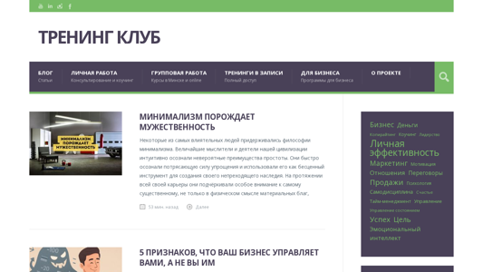 | AI-анализ | --- The portal Trening Club offers training, workshops, seminars, masterclasses, and transformative games for personal and business development. It provides a space for coaching, psychotherapy, and consulting. The website features a blog with articles on personal work, consulting and group work, courses in Minsk and online, and training programs for businesses. The project emphasizes minimalism as a tool for creating a lasting legacy. It offers a masterclass on business survival and growth by Sergey Щербаkov, as well as a mental health checklist. The website is available in Belarusian .BY domain. |