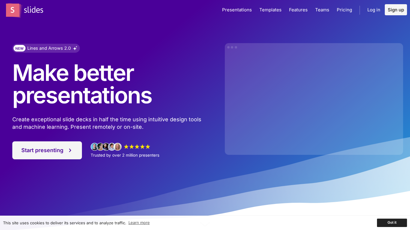 | AI-анализ | The portal Slides is a place for creating, presenting and sharing modern presentations. Users can sign up for free and access a suite of tools to make better presentations, available right from their browser. Unlike traditional presentation software, there's no need to download anything. Collaboration with teams is also easy, with features such as a customizable editor, media library, team-wide collaboration and feedback, and a theme editor that ensures everyone stays on brand. Slides also offers advanced features for developers, with a fully open source format, access to presentation source code, and rich customization options. Over 2 million creators use Slides daily for various purposes, including professional presentations, pitches, school work, and portfolios. |