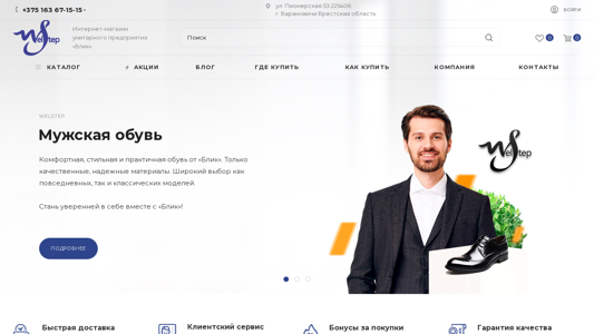 | AI-анализ | The web project "Блик" (Blik) is an e-commerce platform for a single enterprise, offering a catalog of men's, women's, and children's clothing and footwear. The site includes sections for men's and women's wardrobes, featuring separate categories for clothing and footwear. Additionally, there are sections for promotions, a blog, information on purchasing and order placement, delivery and return conditions, product guarantee, company details, news, reviews, careers, contacts, partnerships, diplomas, and certificates. The site also includes a shopping cart and a section for saved items. Telephone numbers for customer service and marketing are provided, along with an address in Baranovichi, Brest Oblast. The domain is welstep.by. |