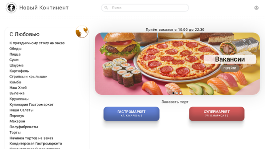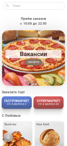 | AI-анализ | The web project "New Continent - GastroMarket Zhobin" is a food market and cafe offering various dishes, drinks, and baked goods for order. The menu includes options for lunches, pizzas, sushi, shawarma, potato strips and wings, combos, sandwiches, salads, pastas, and desserts. The market also sells its own bread and baked goods, as well as various prepared foods, soups, and snacks. Customers can place orders from 10:00 to 22:30 for pick-up or delivery within the city. The project also mentions vacancies and a location on Karl Marx Street 2, with a nearby supermarket at Karl Marx Street 52. The business is registered under the name "EconMarket" with the Unified State Register of Enterprises of |