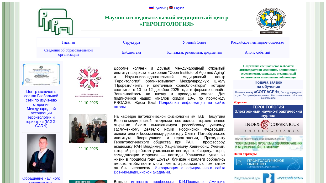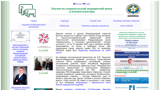 | AI-анализ | language: ru The web project "Научно-исследовательский медицинский центр «ГЕРОНТОЛОГИЯ»" is a Russian research medical center focusing on gerontology and geriatrics. The website includes information about the center's scientific council, its affiliation with the Russian Peptide Society and the Global Network for the Study of Aging, and announcements of upcoming events such as an online international school on resveratrol and cellular chronoblockers. The website also features a blog with articles related to gerontology and geriatrics, and a section for ordering a book on the subject. The center's director, Professor V.V. Pashtulin, is mentioned in an article about a memorial event held in his honor at the Military Medical Academy. An interview with Professor K.I. Proschaev about peptides |