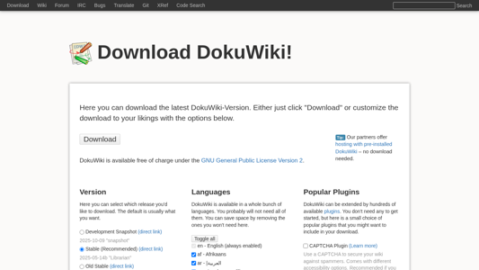 | AI-анализ | This online resource is a download portal for DokuWiki, a free and open-source wiki application. Users can download the latest version of DokuWiki or choose older stable releases. The website offers options for customizing the download, including selecting specific releases, downloading only changed files, or including a minimal webserver with PHP. DokuWiki is available under the GNU General Public License Version 2 and is offered in multiple languages. The website also provides links to archives and upgrade instructions. |