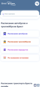 | AI-анализ | language: ru This online resource, Brest.btrans.by, is a public transportation schedule platform for the city of Brest, Belarus. It provides real-time information on the schedules and routes of city buses and trolleybuses. Users can search for transportation by bus stop and view the nearest bus or trolleybus arrival time online. The city of Brest is one of the regional centers in Belarus with a large network of roads and a significant population that relies on public transportation daily for education and work. This service, Btrans.by, offers up-to-date bus and trolleybus schedules in Brest, which can be accessed from various devices (laptops, tablets, and smartphones) at any time of the day. Regular city transportation operates daily from 6:00 AM to 12:00 AM. With this information |