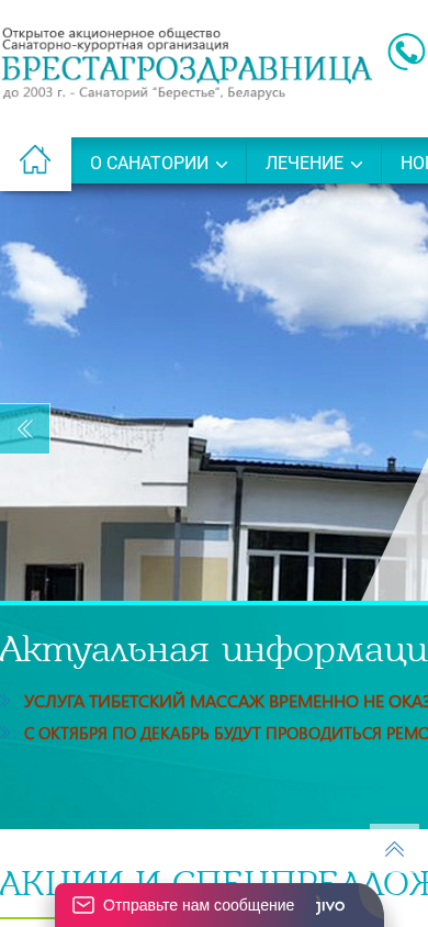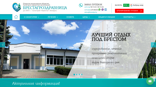| AI-анализ | The web project "Sanatorno-kurortnaya organizatsiya 'Brestagrozdravnitsa' - sanatoriy Berestye, Brest, Belarus | Sanatoriy Berestye, cenы 2025" is a health resort organization in Belarus, specifically located in Brest. The website provides information about Sanatoriy Berestye, including its experienced specialists and modern equipment. The organization offers various forms of accommodation with different sizes, such as one-room, two-room, and two-bedroom options. The website also mentions a sanatorium named "Aleysa" and various services including medical treatments, recreational activities, and catering. The graphical user interface is available in both Russian and English languages, with options to book tickets and contact the resort at +375 (33) 674 |