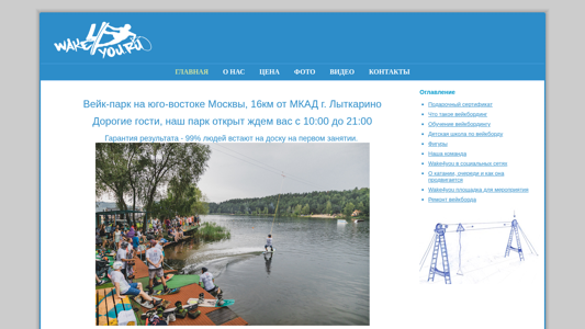 | AI-анализ | The website is a wakeboard park located 16km south-east of Moscow, in Lytkarino. The park, operated by Wake4you, offers wakeboarding lessons for adults and children. The park is open from 10:00 to 21:00. The website provides information about the park, including its location, opening hours, and a guarantee of a successful first-time experience. The park is situated in a forested area near a clean quarry, with golden sandy beaches. Wakeboarding is done in a live queue order. The website includes sections on gift certificates, what wakeboarding is, lessons for children, team Wake4you on social media, and information on the park, repairs, and events. The website was created by Plarson.ru. |