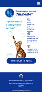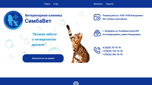 | AI-анализ | The website "SimbaVet" is a veterinary clinic located in Bobruysk, Belarus, specifically at Kombinatskaya Street, number 204 in the 6th microdistrict (Nazarovka region). The website offers various veterinary services including therapy, vaccination, stomatology, surgery, ultrasound diagnosis, blood analysis, chipping, and vet-apteka. The clinic is equipped with modern medical equipment, and professional veterinarians are available for effective treatment of domestic animals. The clinic's operating hours are from 9:00 to 19:00 every day, without lunch breaks or weekends. The primary goal of the clinic is the health and longevity of pets. The website includes sections for services, about us, and contacts, as well as social media links. The clinic's name, "SimbaVet," |
