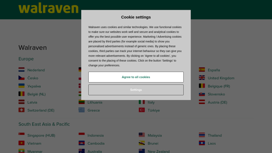 | AI-анализ | This website, titled "The Walraven Group," is a business platform for an international company specializing in the development, production, and sale of innovative fastening, fire-resistant, and sanitary systems. The description indicates the company's activity in various sectors and countries. The website includes options to download product information, create a product wish list, and visit international websites. The footer section contains information about various countries and languages, as well as links to the disclaimer, privacy policy, and cookie settings. The website uses cookies and similar technologies for functionality, analytics, and marketing purposes. Users can agree to all cookies or change their preferences in the settings. |