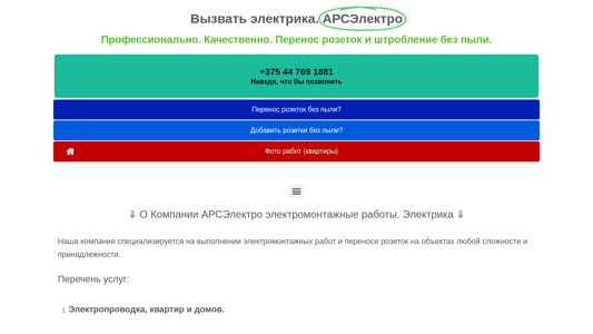 | AI-анализ | The website is a professional electrical services company based in Minsk and Bobruysk, Belarus. It offers electrical installation and wiring services, including the transfer of electrical outlets and switches without creating dust. Users can contact the company by dialing +375 44 769 1881 or clicking the "Call" button on the website. The company specializes in various electrical services, such as electrical wiring in homes and industries, the installation and replacement of electrical outlets and switches, and electrical safety measures. The website provides information about their services, including pricing and documentation, as well as showcasing their previous work through images and a menu. The company also offers smart home solutions, such as Google Home integration, and solar energy services. The website is operated by the company AРСЭлектро. |