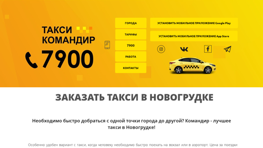 | AI-анализ | The web project "Taxi Commander Novogrudok" offers taxi services in Novogrudke, Belarus. The short phone number for orders is 7900. Clients can order a taxi online and download a mobile application. The company provides the lowest prices and tariffs for rides, along with bonuses and discounts. Clients can also work as taxi drivers. The website offers information on city tariffs, a link to download the mobile application from Google Play and App Store, and a contact telephone number. Customers can also become partners with Google Play and App Store. Additionally, there is a Telegram bot for tariffs, and the company guarantees a safe and comfortable ride for clients. The taxi can be ordered by phone or through the mobile application, which allows for a more convenient online booking process. The application also features a bonus program for discounts, and clients can pay for rides using cash |