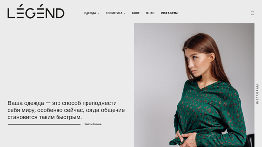 | AI-анализ | The web project 'Legendstyle.by' is a clothing and cosmetics e-commerce store. The website offers a wide range of products, including men's and women's clothing such as dresses, trousers, shirts, jackets, and underwear. Additionally, the store sells various cosmetics items like lotions, body creams, gels, and soaps. The website's title is 'Главная' (Main), and the description emphasizes the importance of feeling good in beautiful things, stating that 'when you feel good in beautiful things, anything can happen.' The top keywords include 'byn,' 'корзину' (cart), 'одежда' (clothing), and various cosmetics terms. The website also features a blog and an Instagram account for users to explore. The products in the cart currently total to 0.00 BYN. |