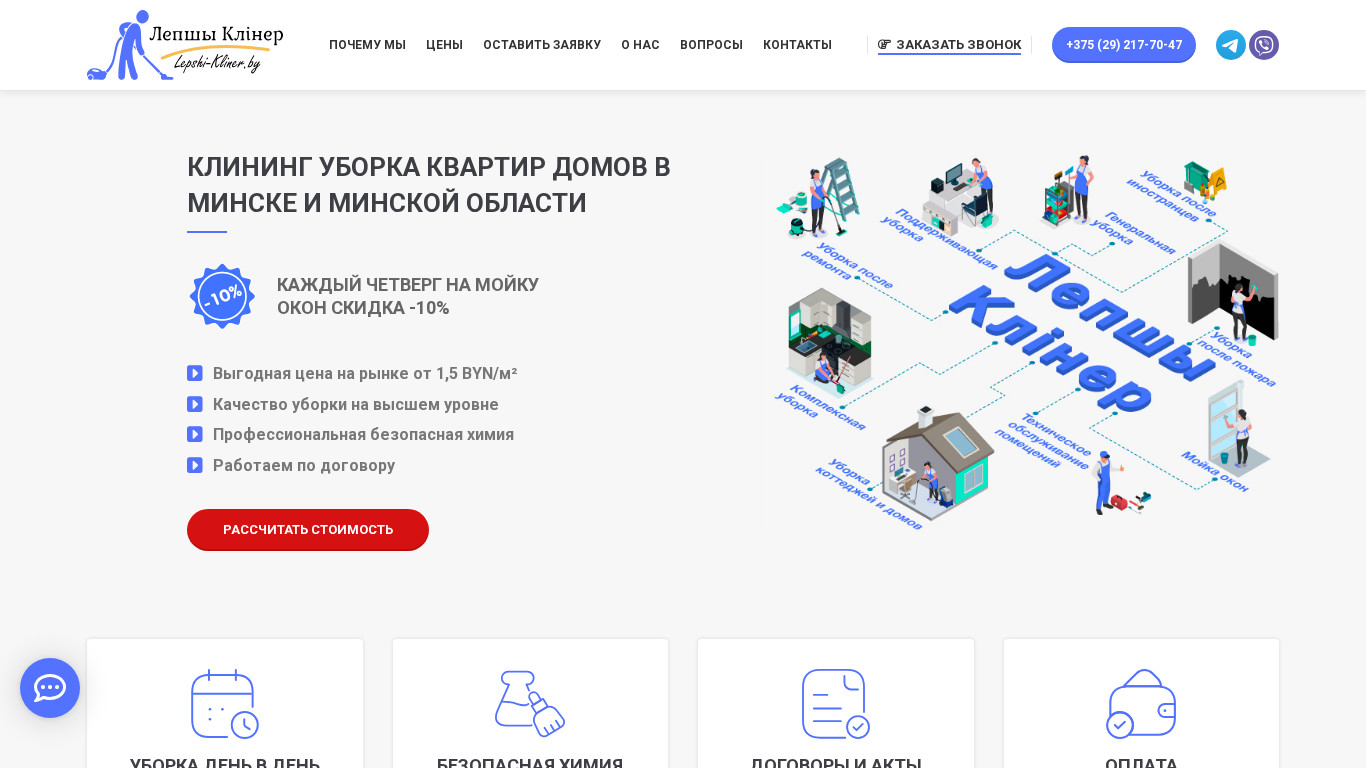 AI-анализ | The web project "Lepshi Kliner" offers cleaning services for apartments, houses, and other spaces in Minsk and the Minsk region. The company provides general cleaning, comprehensive cleaning, cleaning after repair, cleaning of houses and cottages, window cleaning, cleaning after foreigners, and cleaning after a fire, among others. The website features a section for supporting cleaning, where customers can order daily cleaning services. Prices start from 1.5 BYN per square meter, and the quality of cleaning is at a high level with the use of professional and safe chemicals. Customers can place orders and make payments by card or cash. The website includes a form to request a quote and a menu for contact information. The company adheres to a confidentiality policy. The website is available at lepshi-kliner.by. |