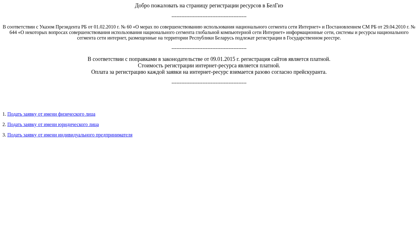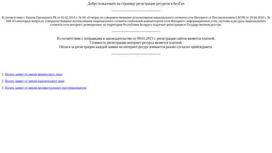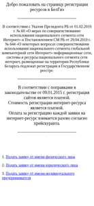 | AI-анализ | The website is a registration page for resources in BelGiE, the national segment of the Internet in Belarus. Welcome to the BelGiE resource registration page. In accordance with Presidential Decree No. 60 of February 1, 2010 and Resolution No. 644 of the Council of Ministers of April 29, 2010, information networks, systems, and resources on the national segment of the Internet in Belarus must be registered in the State Register. Starting from January 9, 2015, registration of websites is a paid service. The cost of registering an internet resource is a one-time fee, payable upon submission of each application for an internet resource, according to the pricing schedule. The user can submit an application on behalf of a physical person, a legal entity, or an individual entrepreneur. The domain name for this |
