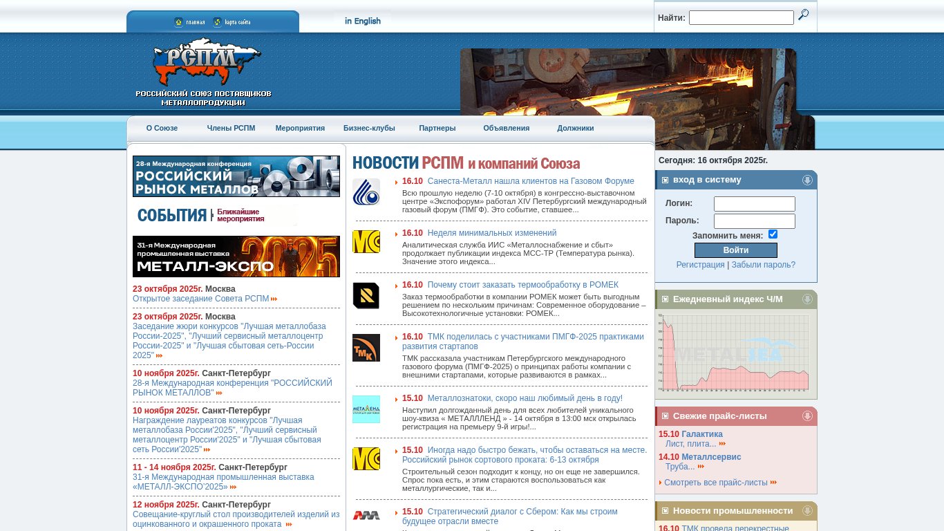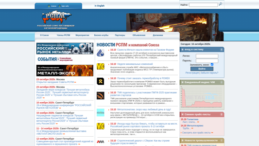 | AI-анализ | The portal Russian Union of Metal Suppliers | Russian Union of Metal Suppliers (rspm.ru) is a business-to-business platform focusing on the Russian metal market. The website provides information on the Russian Union of Metal Suppliers (RSPM), its goals and tasks, history, and regional activities. It includes sections on banners, news, contacts, directory, members, maps, price lists, events, and business forums for various regions in Russia. The website features upcoming and past news, conferences, and exhibitions related to the metal industry, as well as a video channel and opportunities to propose business clubs. The RSPM website also includes sections on debtors and partnerships, and offers various announcements and declarations. The site's calendar lists several events taking place in Moscow, Sanкт-Петербург, and other Russian cities from October to November 2025, including open sessions |