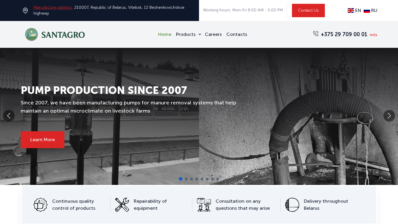 | SEO-описание | Development, manufacturing of pumps and manure removal systems. We offer a wide range of specialized equipment, primarily focused on maintaining a favorable microclimate and comfortable conditions in livestock farms. |