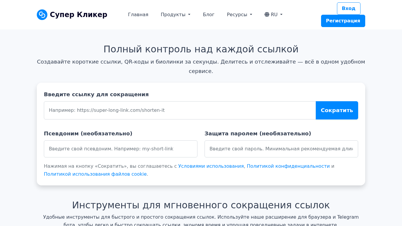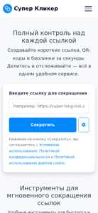 | AI-анализ | This website is a link shortening and management service with analytics, named Super Clicker. Users can create short links, QR codes, and bio-links quickly. The service offers easy link shortening, full analytics, and management tools in one place. |