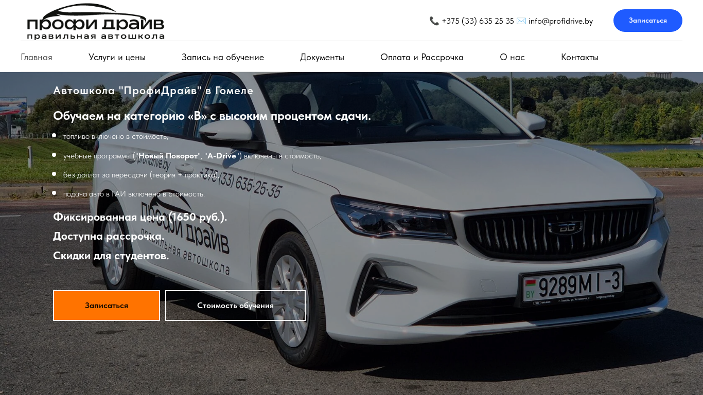 | SEO-описание | Автошкола ПрофиДрайв в Гомеле. Топливо, все пересдачи, машина в ГАИ - все включено. Оптимальная цена + качественное обучение. Рассрочка. |